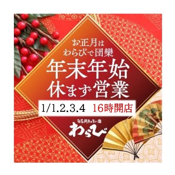 年末年始🎍全店休まず営業! 2025.12.19 Post Share わらび全店舗、 年末年始休まず営業します‼ 1/1・2・3・4は16時開店‼ ご家族やご友人と、ごゆっくりお楽しみください。 ※混雑が予想されますので、早めのご予約がおすすめです。 Post Share